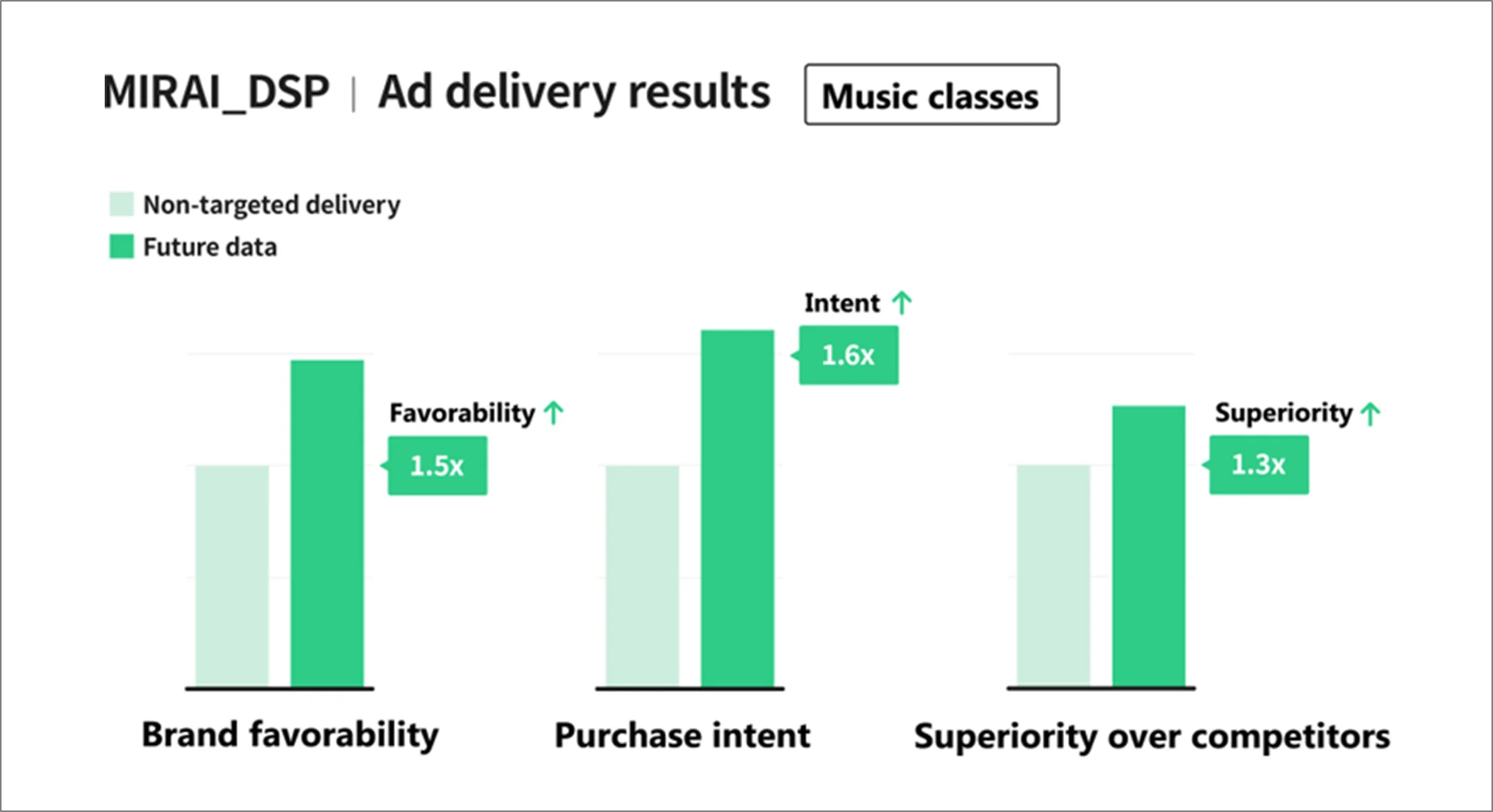 Music classes: Brand favorability, 1.5 times; purchase intent, 1.6 times; Superiority over competitors, 1.3 times