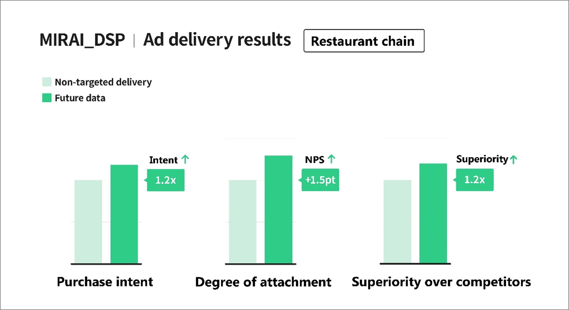 Purchase intent and superiority over competitors were 1.2 times higher than non-targeted ad deliveries. Degree of attachment as measured by NPS rose 1.5 points.