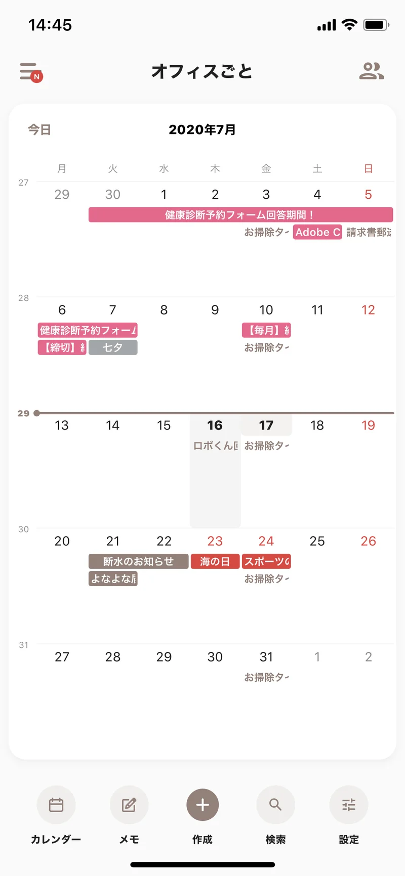 経費精算や勤怠申請の締め切りなど、毎月の忘れてはいけない予定を入れています