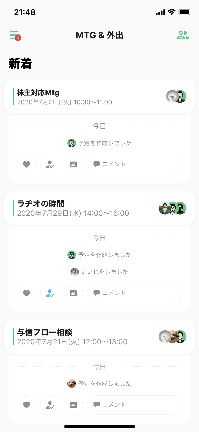 新着順に登録された予定が並んでいて、ざーっとスクロールすれば簡単に確認ができます。予定への参加や「いいね」のリアクションも簡単にできます🙋🏻♂️