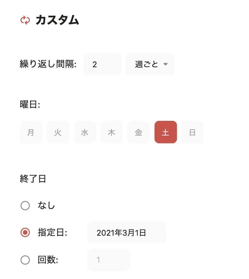 カスタム設定はさらに詳細な繰り返しが設定できます