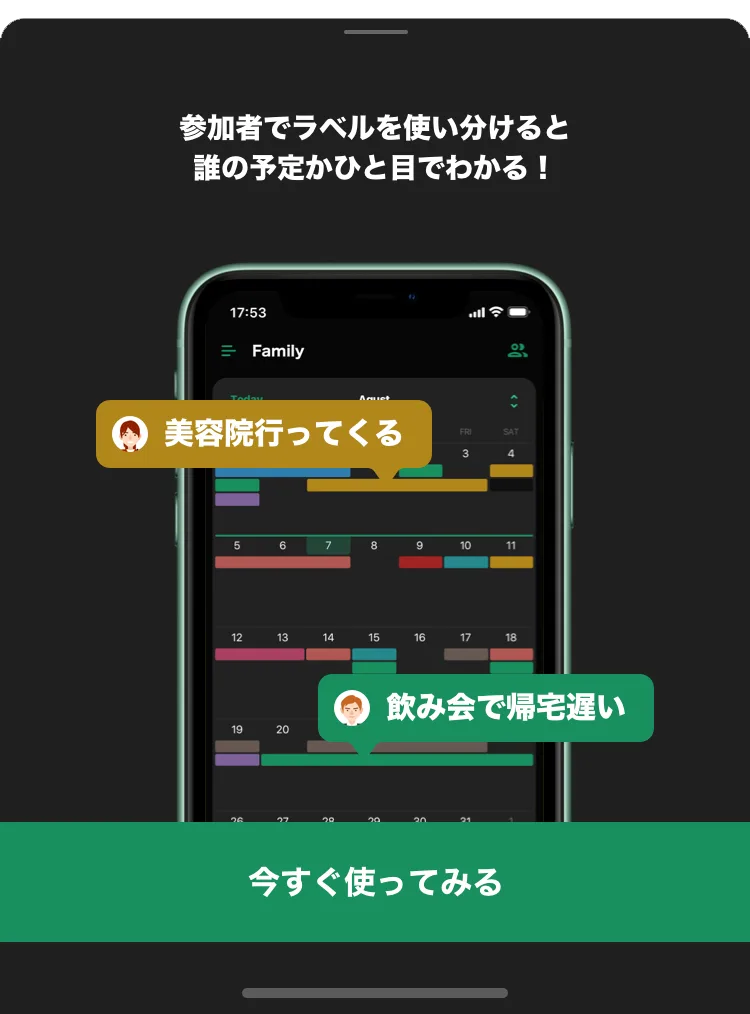 夏休みがはじまってソロリティ(学生クラブ)やアルバイトで忙しく、友達と全然予定が合わないため、予定を共有し合うのにTimeTreeを導入してくれたのです。