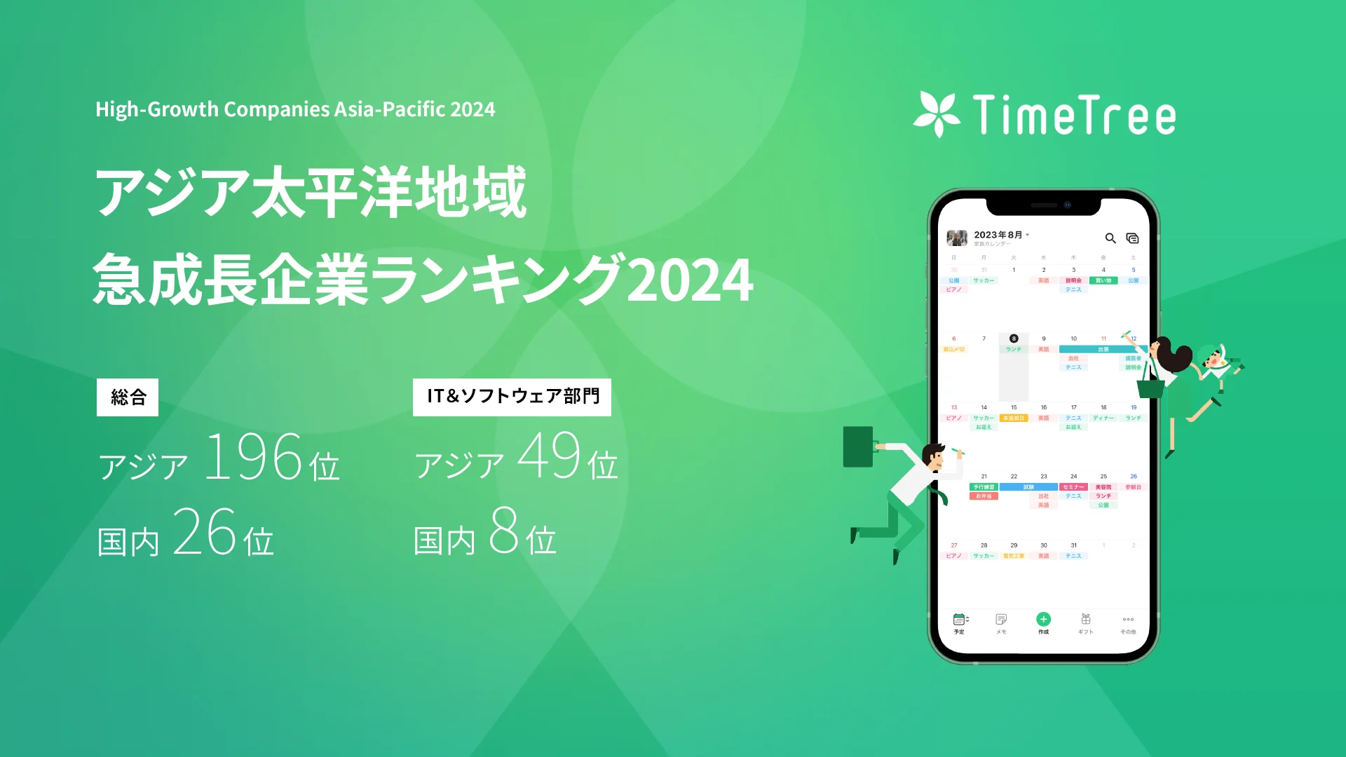 カレンダーシェアアプリ「TimeTree」を運営する株式会社TimeTree(本社:東京都新宿区、代表取締役社長:深川 泰斗、以下TimeTree)は、英・Financial Times社と独・Statista社が共同で実施した、アジア太平洋地域における急成長企業ランキングの上位500社を選出する「FT ranking: High-Growth Companies Asia-Pacific 2024(アジア太平洋地域における急成長企業ランキング2024)」において、総合ランキングで196位(国内 26位)、IT&ソフトウェア部門で49位(国内 8位)に選出されました。