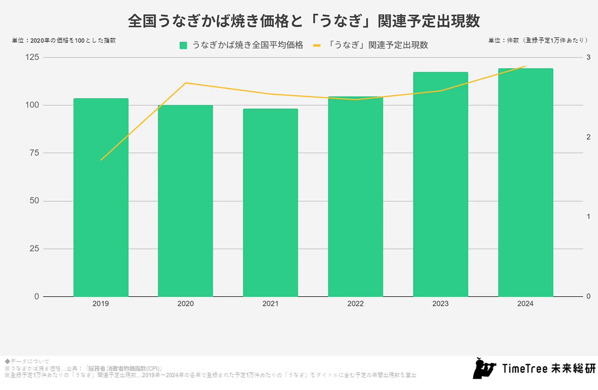 一般的に食事の予定は「レストラン名」などで登録されることが多く、「うなぎ」のような食材名で登録されることは多くありません。しかし、価格の高騰によってうなぎはこれまで以上に特別なものとなり、「あえて予定として登録する価値のある非日常の食事」としての認知が高まったことから、このような結果となったのかもしれません。