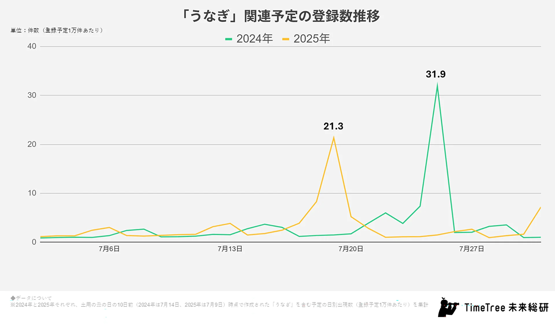 なお、去年に比べて今年の土用の丑の日がどの程度盛り上がりそうかについても検証してみました。2025年と2024年それぞれ、土用の丑の日の10日前時点で、土用の丑の日に登録された「うなぎ」関連予定数を見ると、2024年は登録予定1万件あたりの「うなぎ」関連予定数は31.9件、2025年は21.3件と去年の2/3程度に留まる結果に。