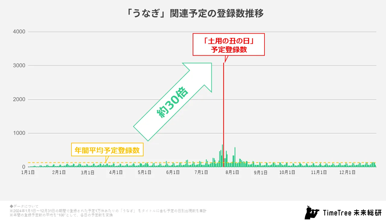 まずは2024年に登録された予定データから土用の丑の日に「うなぎ」関連の予定がどのぐらいされるのかを調べたところ、2024年の土用の丑の日(7月24日)には、「うなぎ」をタイトルに含む予定が年間の平均登録数の約30倍にものぼることがわかりました。
