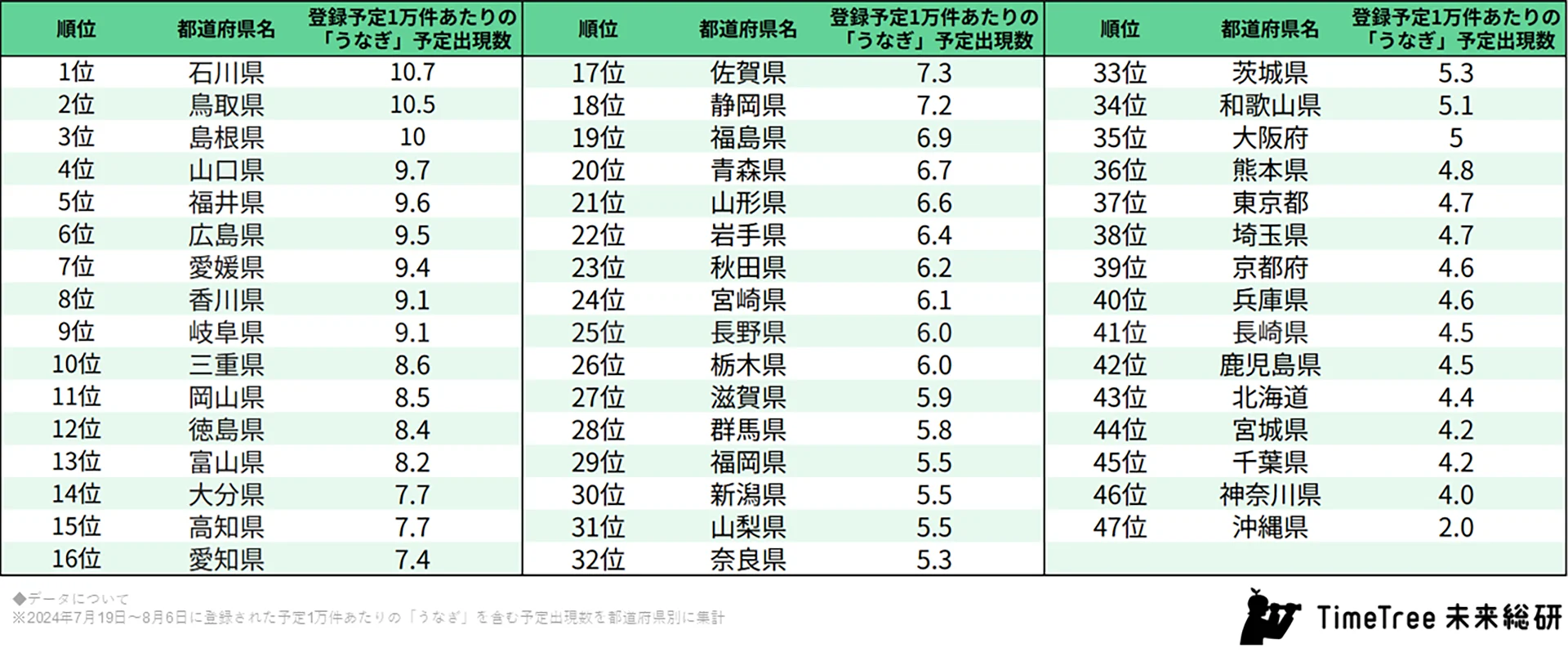 夏の土用期間、うなぎの予定数ランキング1位は石川県!上位を中部・中国地方と四国が占める結果に
