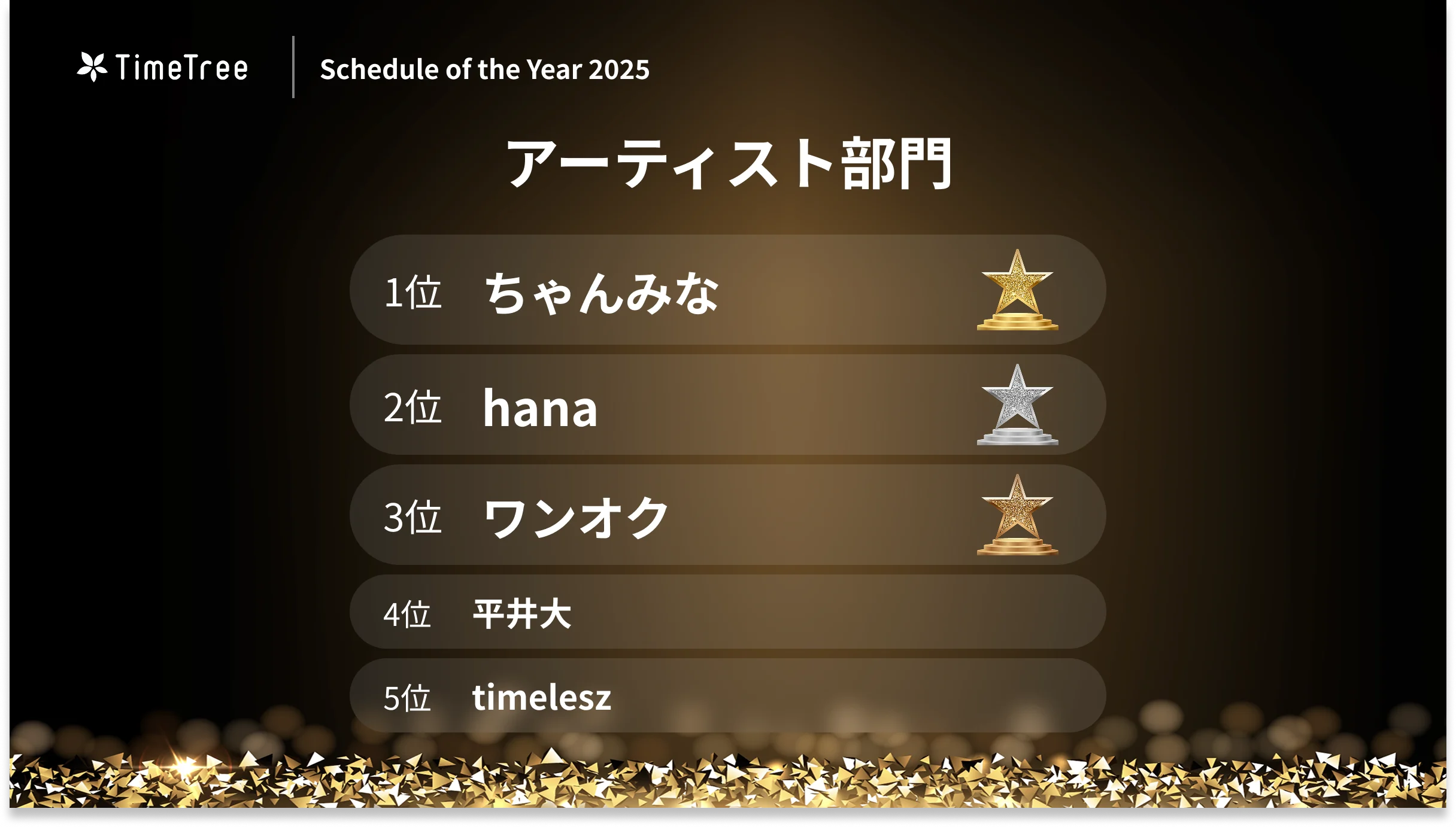 アーティスト名に関する予定が対象となる「アーティスト部門」では、「ちゃんみな」が1位にランクイン。ホール〜アリーナまで14公演を巡る全国ツアー「AREA OF DIAMOND 3」の発表が大きく影響したと考えられます。また、ガールズグループオーディション「No No Girls」などへの関与により、次世代ガールズカルチャーの象徴として「推し活」熱が高まり、ライブ・配信視聴・発売日の登録が一気に増えたと推測されます。