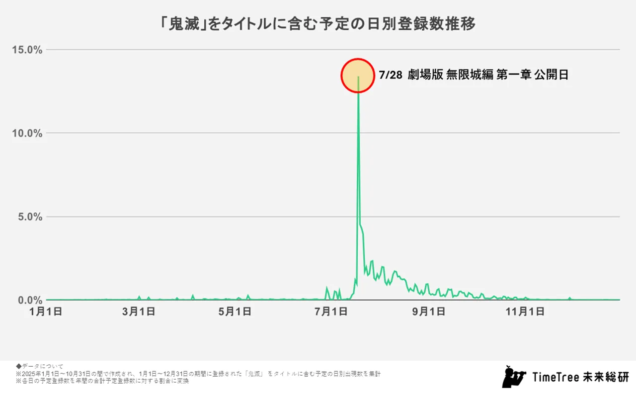日別の予定登録数推移を見ると、公開から数日の間に多くの予定が集中しておりました。特に公開初日には爆発的な伸びがあり、TimeTreeに登録された予定のおよそ90件に1件が「鬼滅」関連の予定だったことがわかりました。