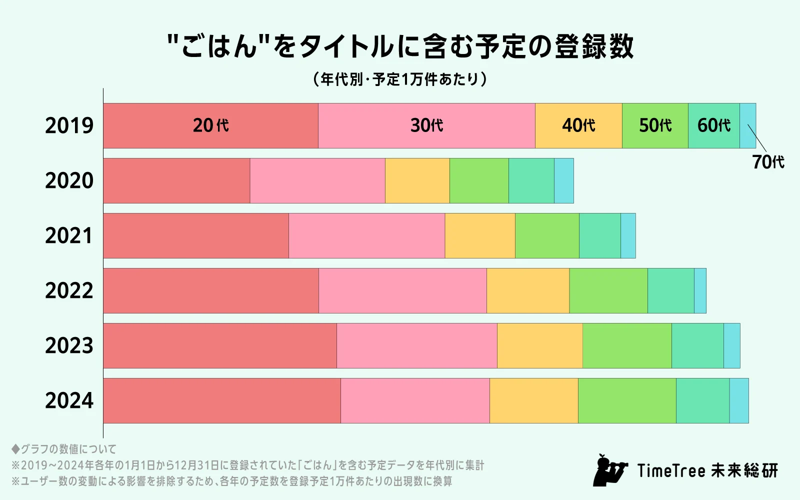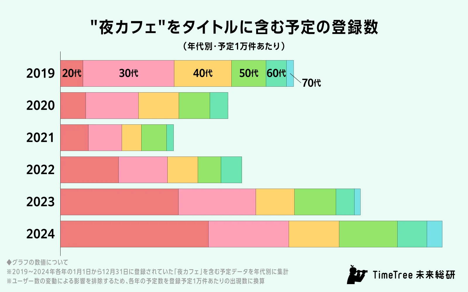 20代・30代ユーザーの予定データを見ると、「飲み」「🍺(ビールの絵文字)」など、飲み会を連想させるワードはコロナ禍で大きく減少したあと、再び増加に転じています。20代では直近で2019年を上回る水準まで回復しており、30代も緩やかな増加傾向が見られます。