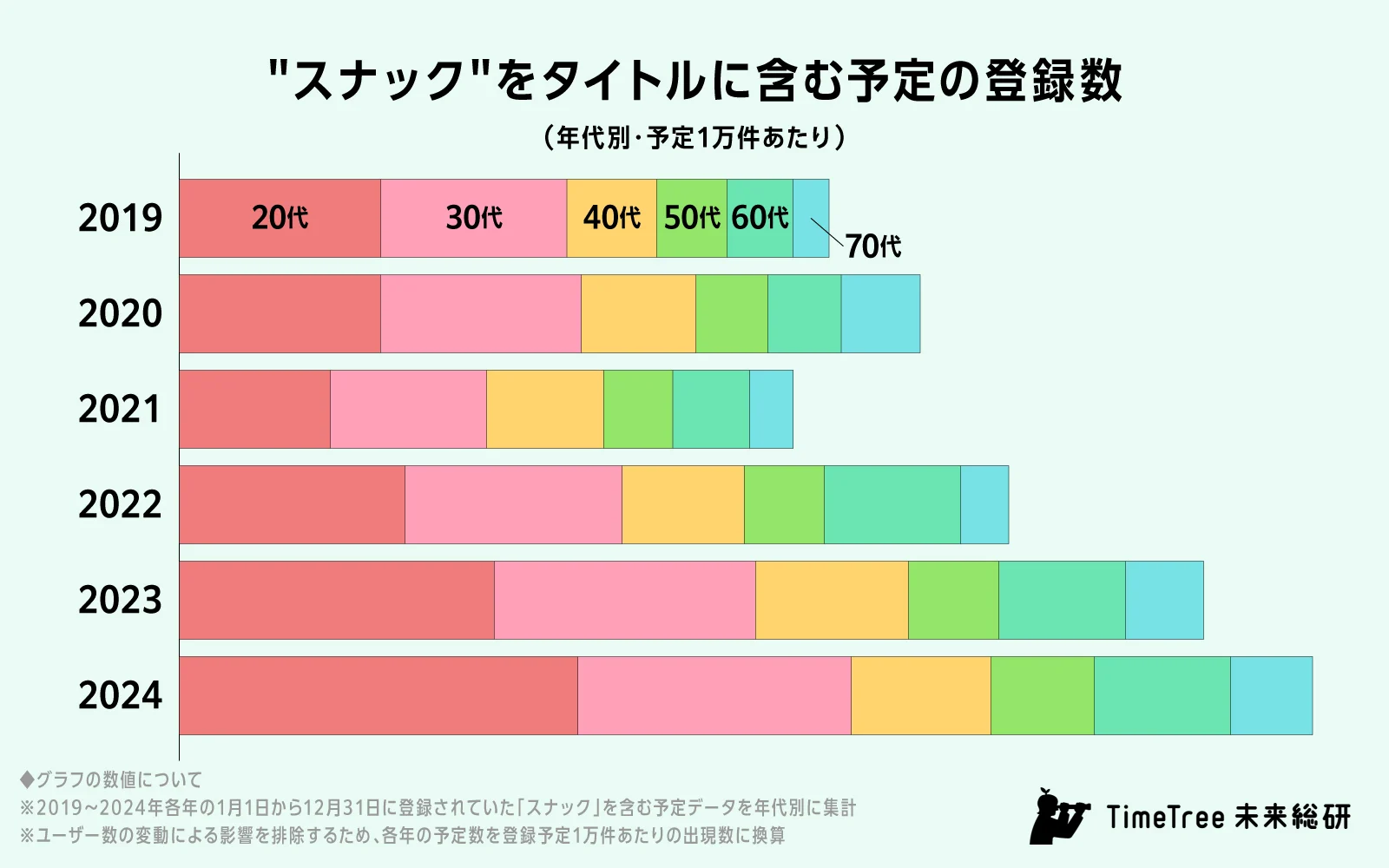 深川 「『スナック』も20代が大きく伸びているんです。昔は二軒目で行く場所でしたよね。でも今は、わざわざ予定に『スナック』と書き込んで出かけていく。しかも、それが20代の予定に多く出てくるところが興味深いです」