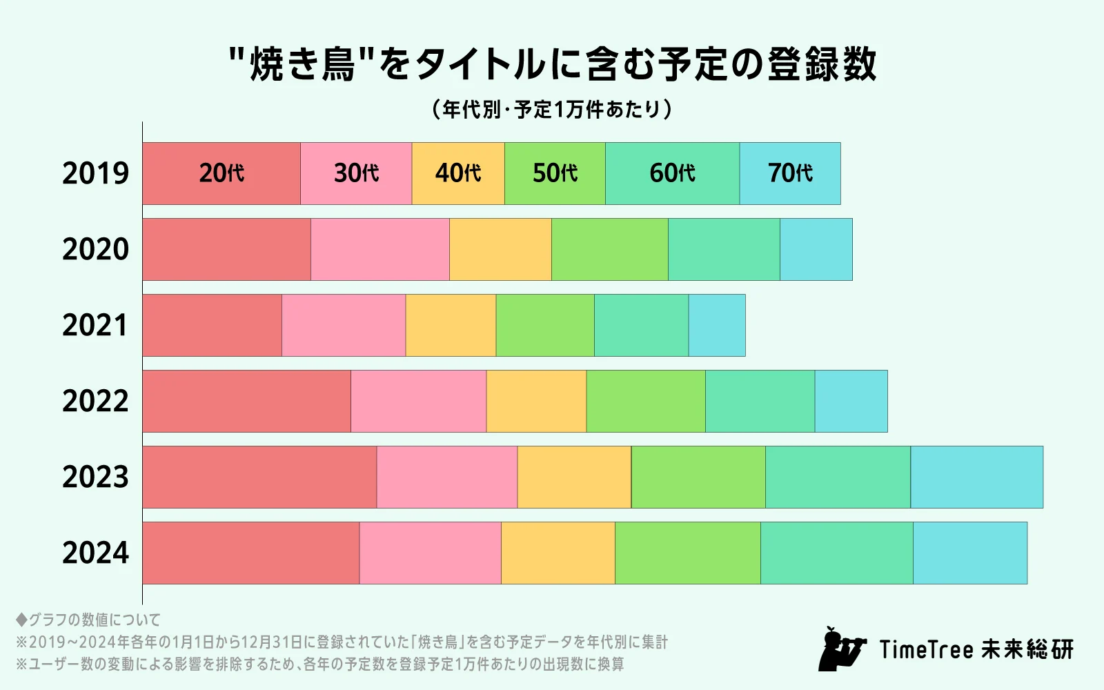 さらに、ここ数年の20代で特に目立つのが、「焼き鳥」「スナック」といった具体的な場を表すワードの増加です。
