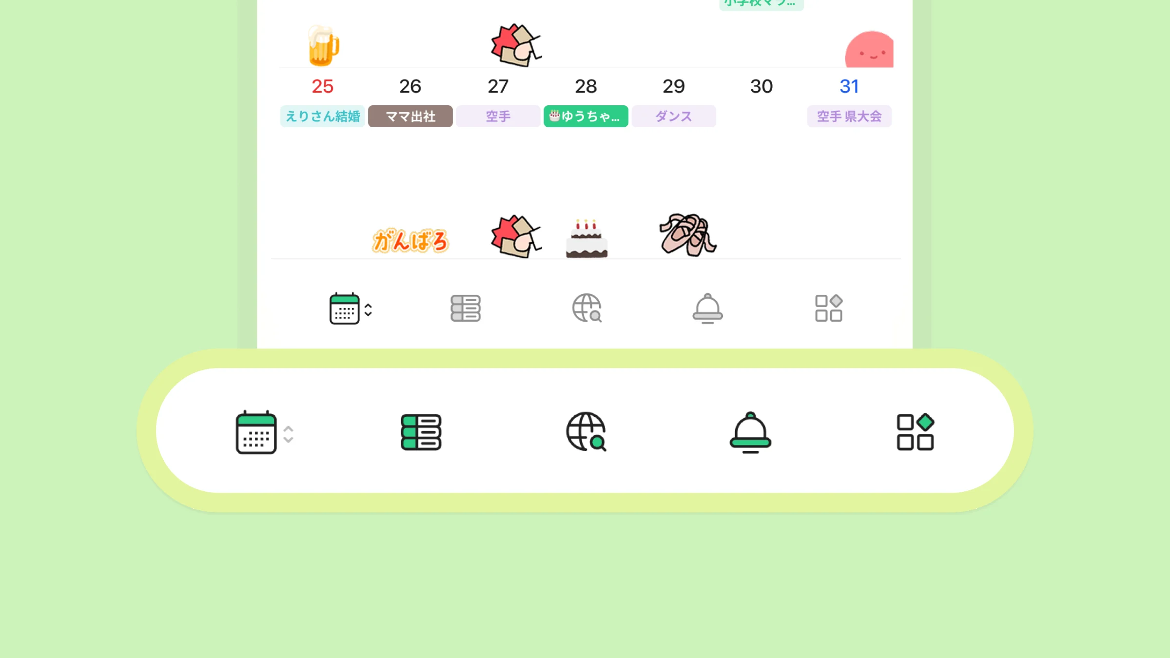 毎日の予定の確認や作成を、これまでより少ないタップで行えるようになりました。 どの画面にいるかもひと目で分かり、「見る・共有する・みつける」を気持ちよく切り替えられます。