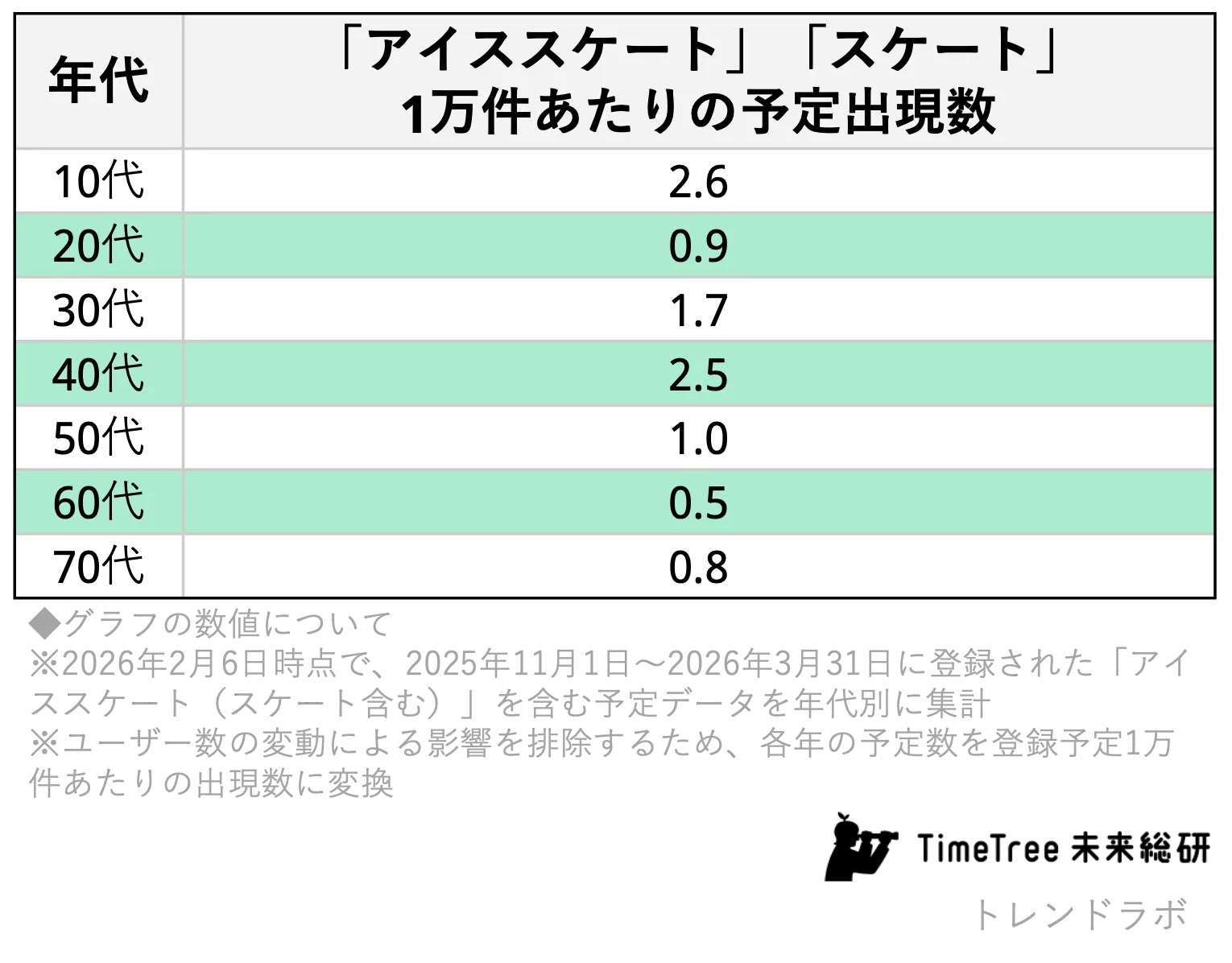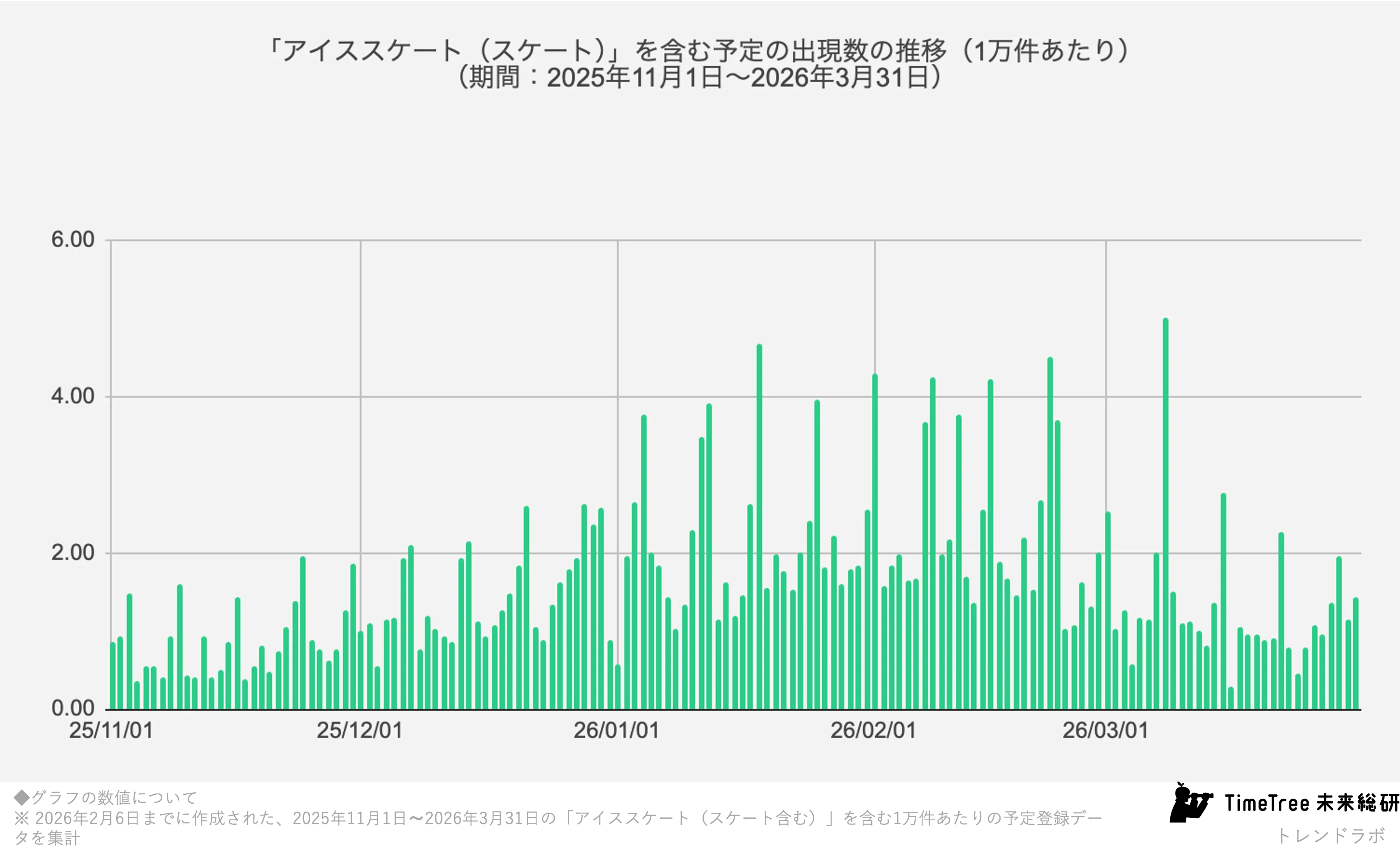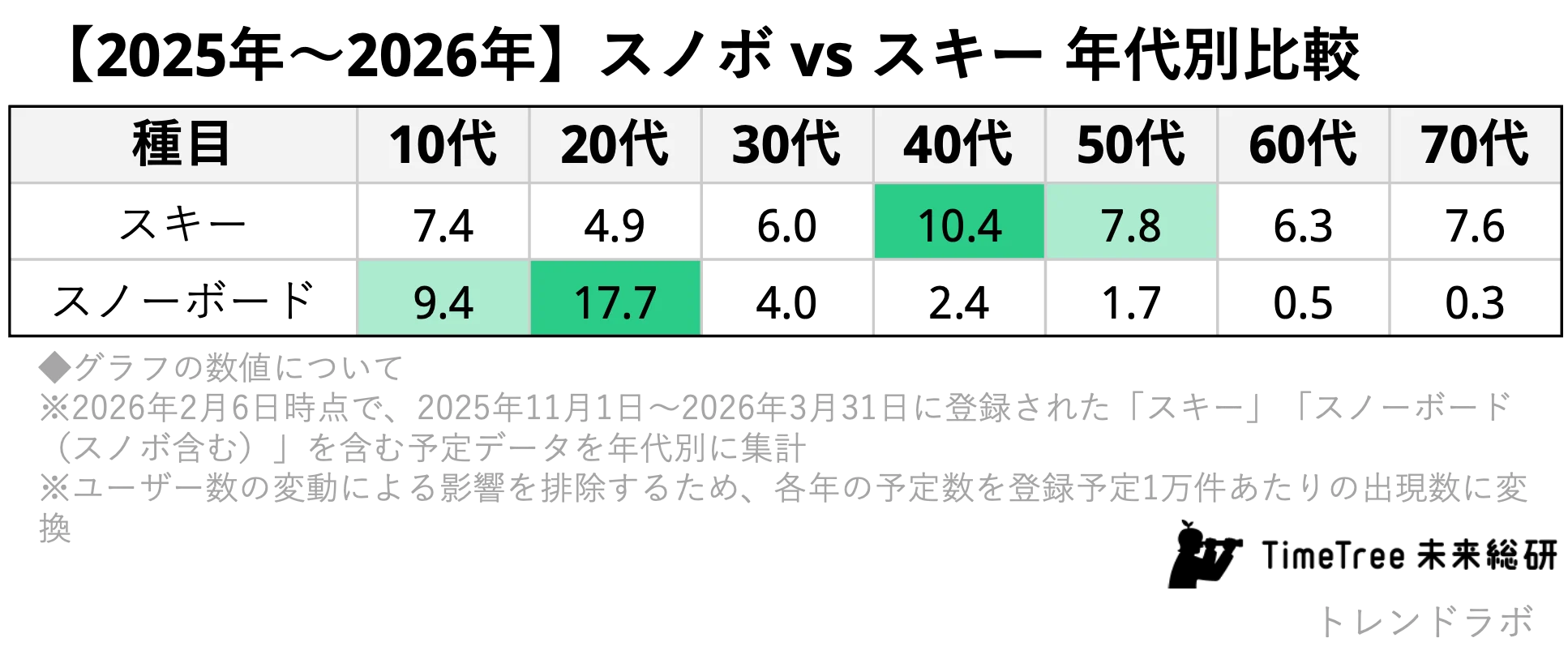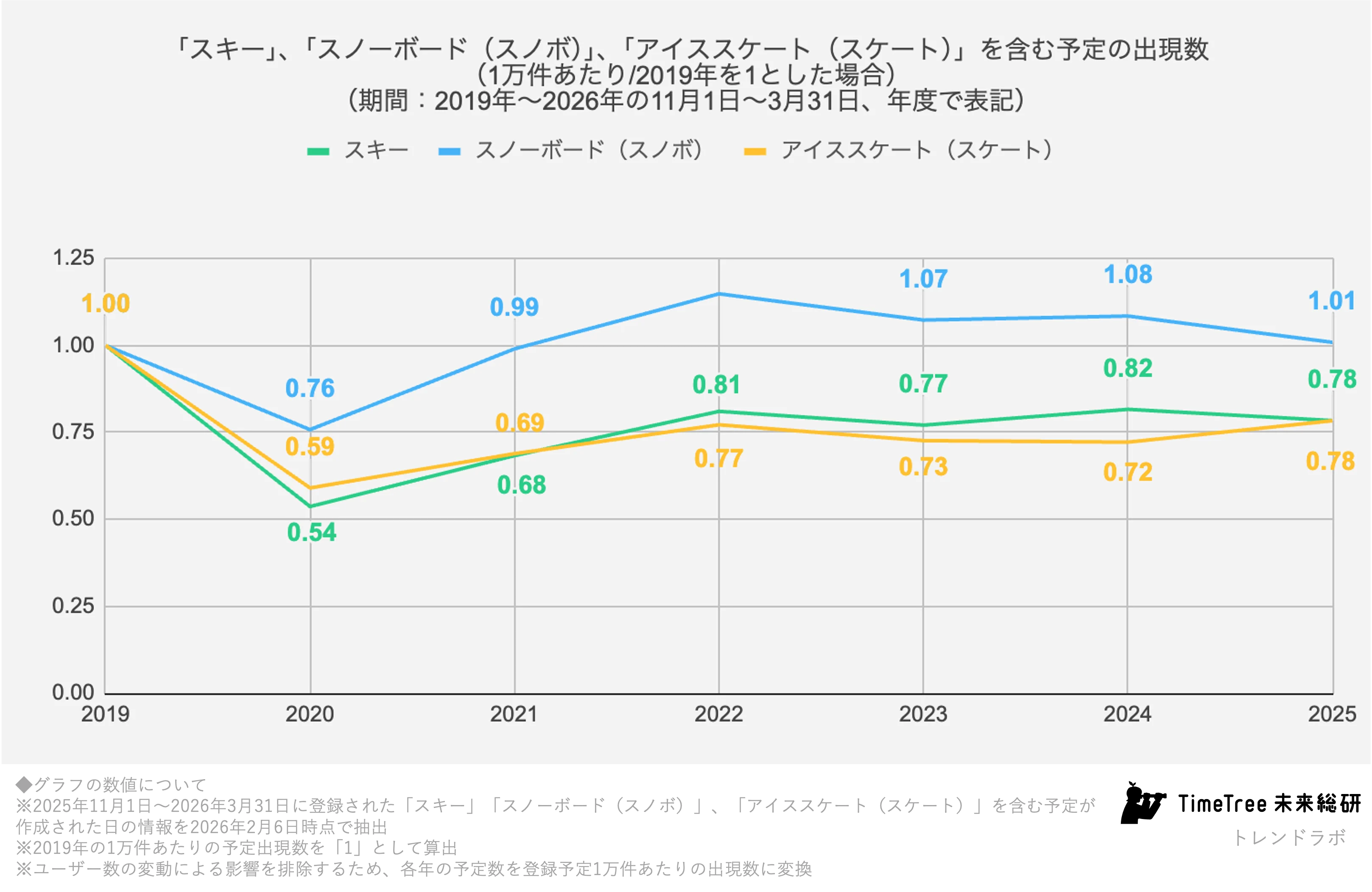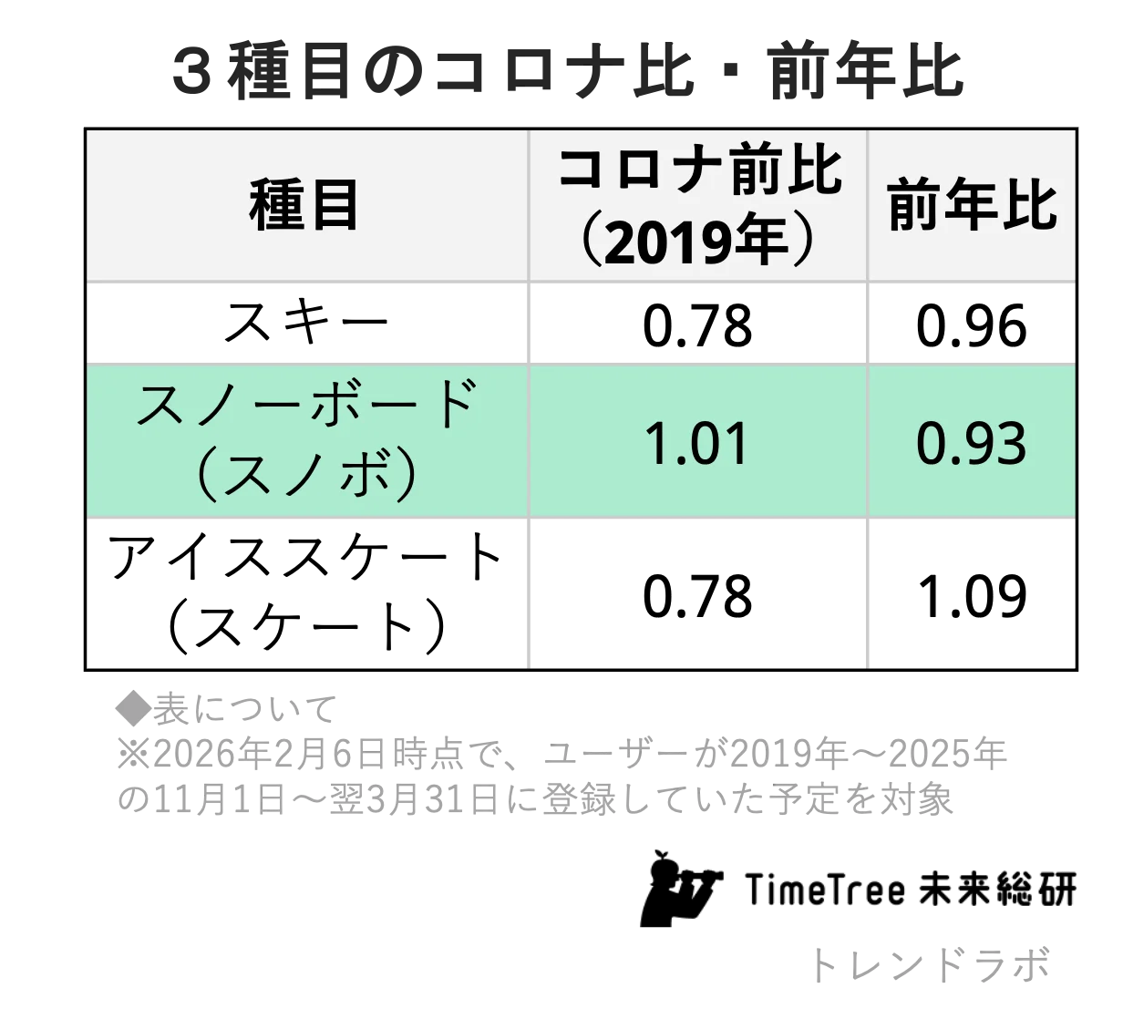 株式会社TimeTree(本社:東京都新宿区、代表取締役社長:深川 泰斗)の社内研究所『TimeTree未来総合研究所』(https://timetreeapp.com/intl/ja/future-research-institute)は、2026年2月6日、ミラノ・コルティナ冬季五輪が開幕したことを受け、スキー・スノーボード・アイススケートのウィンタースポーツに注目し、予定データを分析。3種目でそれぞれ異なる時期や年代に選ばれているのが明確になっていることが明らかになりました。スノーボードはコロナ以降2022年頃から回復傾向にあり、今シーズンは2月6日時点でコロナ前比101%となりました。さらに回復基調の背景には20代を中心とした若者層が牽引していることが明らかになりました。一方、30代以降はスキーが上回り40代がピークとなるなど、ファミリーで楽しむアクティビティとして定着している様子が伺えました。また、アイススケートはコロナ以降微増しながら回復傾向にあり、前年比は3種目の中で109%と唯一の成長を示しました。
