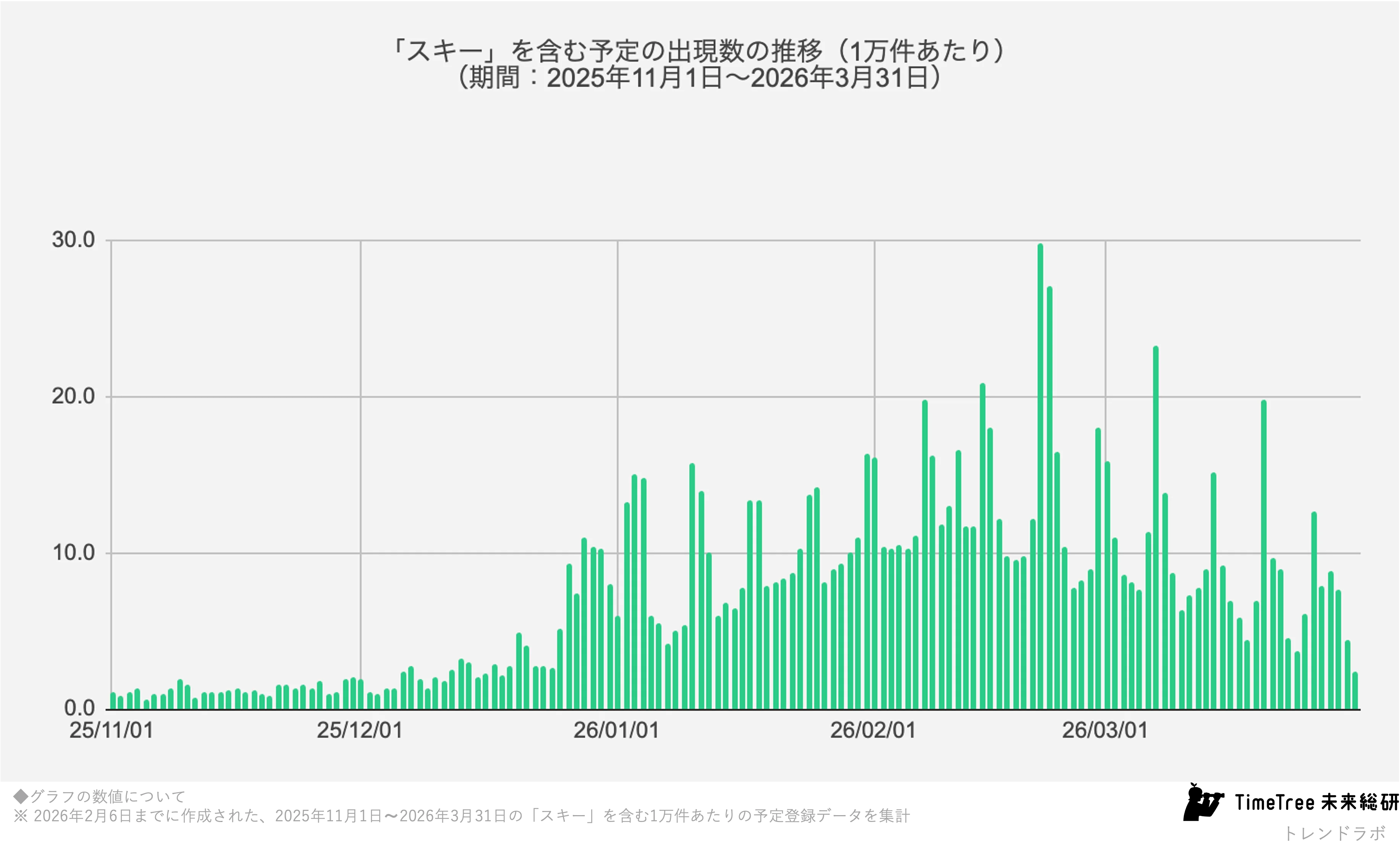 日別の予定の推移をみると、スノーボードと同様に、2月中旬〜下旬に大きなピークを迎えるスキー。2月21日(土)には29.9件と、予定登録出現数が期間中(2025年11月1日〜2026年3月31日)の最高値を記録しました。