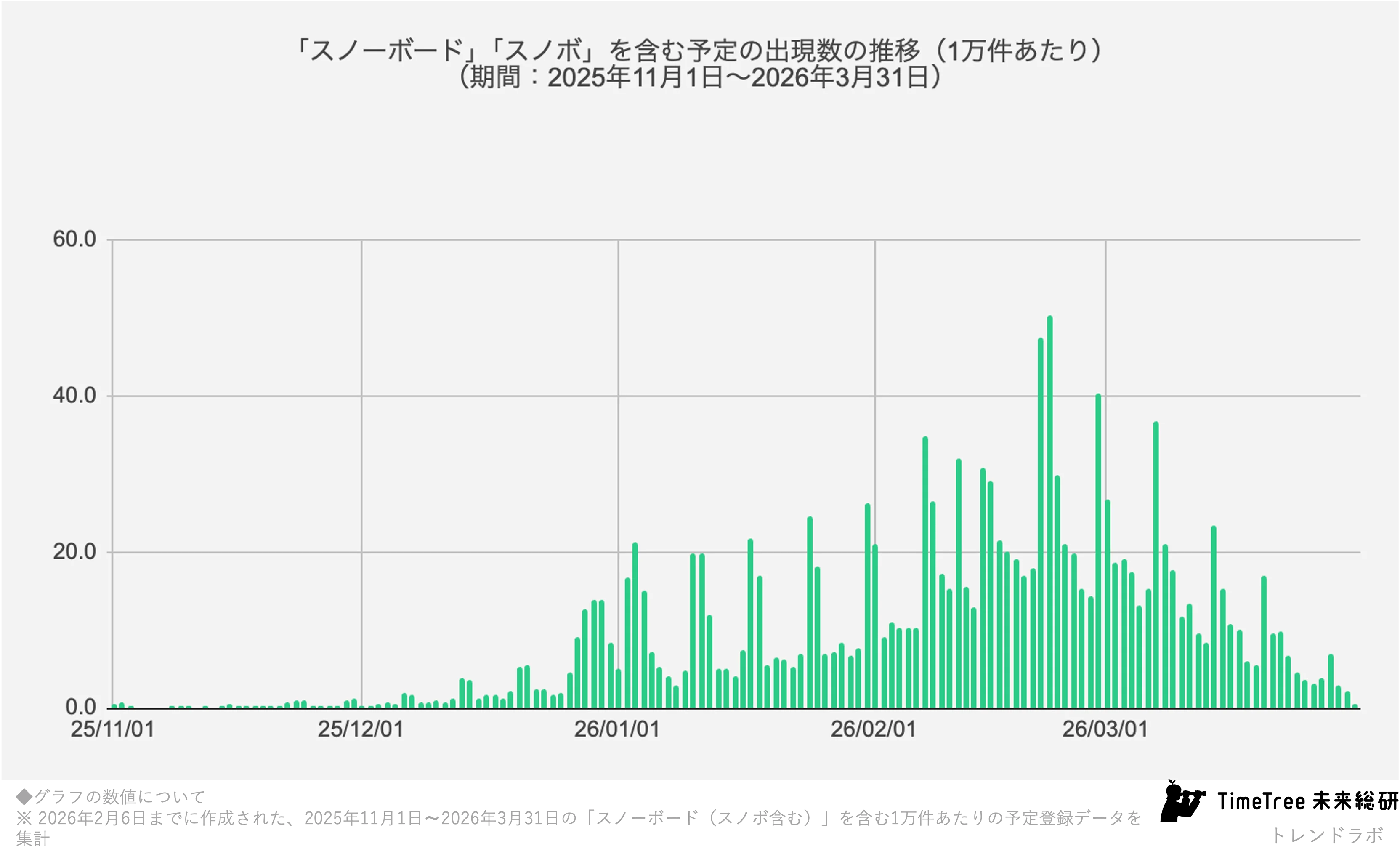 スノーボード(『スノボ』キーワード含む)の日別の推移をみると、11月から徐々に高まり、1月中旬以降さらに増加、2月下旬に最大のピークを迎えることが明らかになりました。特に2月22日(日)には1万予定あたり50.3件と、全期間で最高値を記録しています。今年はさらに2月にミラノ・コルティナ五輪が開催されることから、チームジャパンの活躍から、スノーボードの予定登録数は今後も伸び続けるかもしれません。