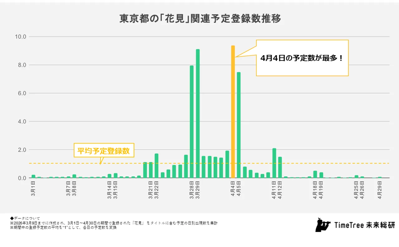 【TimeTree未来総研 トレンドラボ】花見予定数はコロナ後最多 東京の花見予定は4月4日をピークに前週週末にも予定集中
