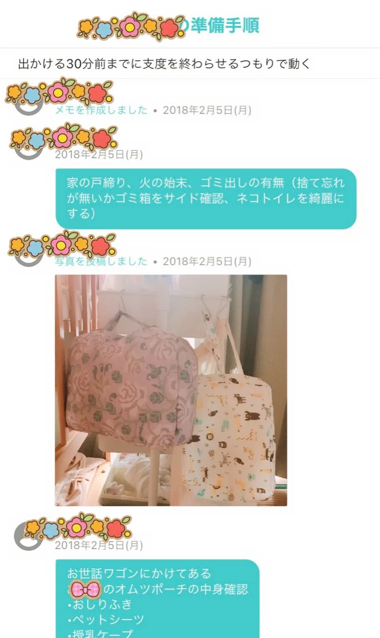 「メモ機能に0歳の娘とのお出掛け手順を写真付きで投稿して、 3人でお出掛けの時はこれを見て準備を整えます。うっかり忘れ物があるからチェックリストになるし一石二鳥です。」