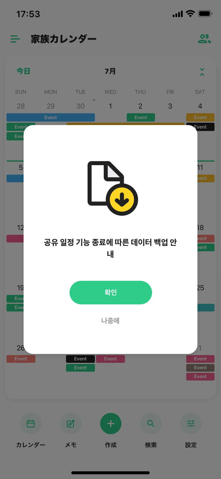 주의 '공유 일정' 기능을 사용하여 추가한 이미지 데이터는 백업 데이터에 포함되지 않습니다. 양해 부탁드립니다.